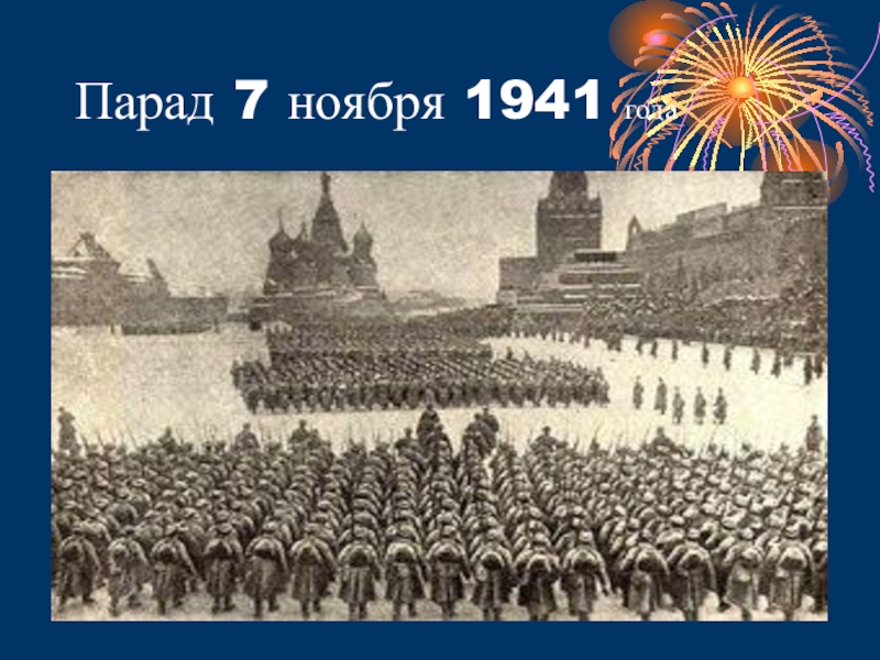 В октябре 1941 немецкие войска вплотную подошли к Москве. 20 октября было введено осадное положение. 7 ноября прошел военный парад на Красной площади, солдаты шли сразу на фронт, на защиту Родины.