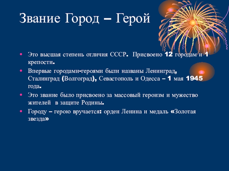 Это высшая степень отличия СССР. Присвоено 12 городам