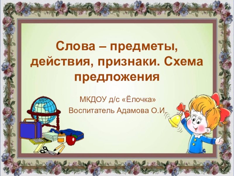 Слова – предметы, действия, признаки. Схема предложенияМКДОУ д/с «Ёлочка»Воспитатель Адамова О.И.