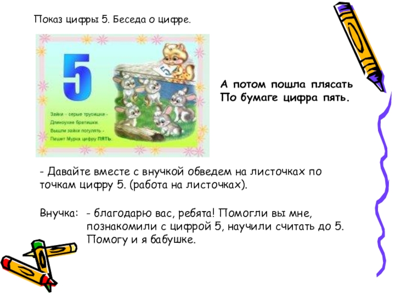 - благодарю вас, ребята! Помогли вы мне, познакомили с цифрой 5, научили считать до 5. Помогу и я бабушке.