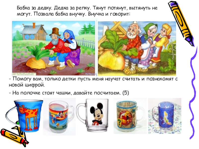 - На полочке стоят чашки, давайте посчитаем. (5)