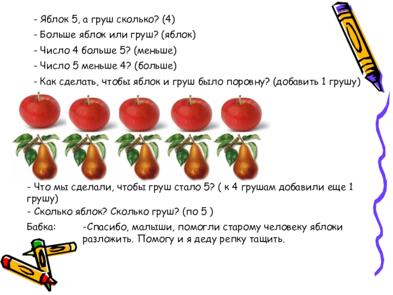 - Сколько яблок? Сколько груш? (по 5 )