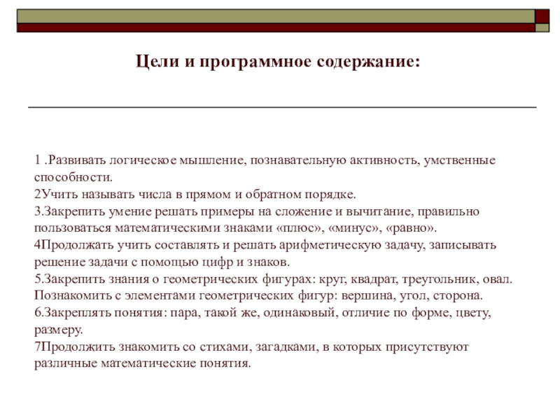 7Продолжить знакомить со стихами, загадками, в которых присутствуют различные математические понятия.