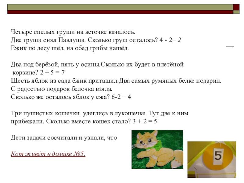 Три пушистых кошечки улеглись в лукошечке. Тут две к ним прибежали. Сколько вместе кошек стало? 3 + 2 = 5