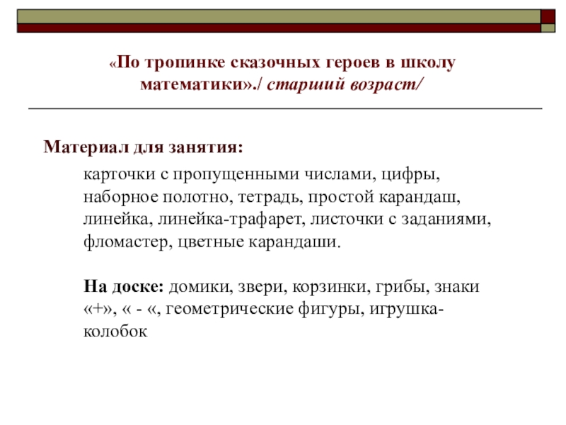 Слайд 2 «По тропинке сказочных героев в школу математики»./ старший возраст/