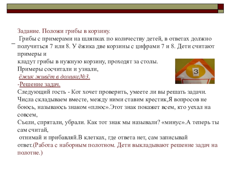 получиться 7 или 8. У ёжика две корзины с цифрами 7 и 8. Дети считают примеры и