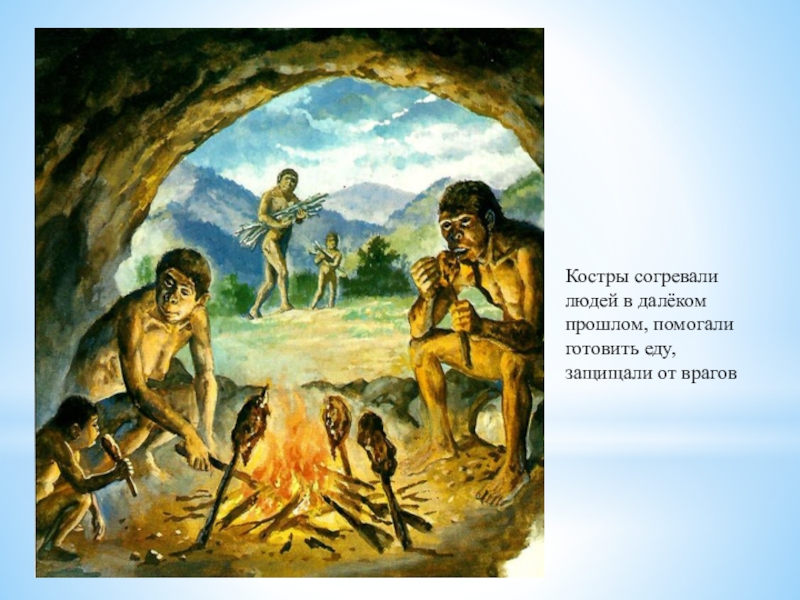 Слайд 4Костры согревали людей в далёком прошлом, помогали готовить еду, защищали от