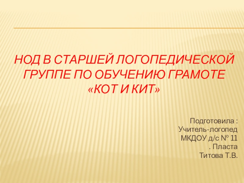 Нод в старшей логопедической группе по обучению грамоте «Кот и кит»Подготовила :Учитель-логопед МКДОУ д/с № 11. ПластаТитова
