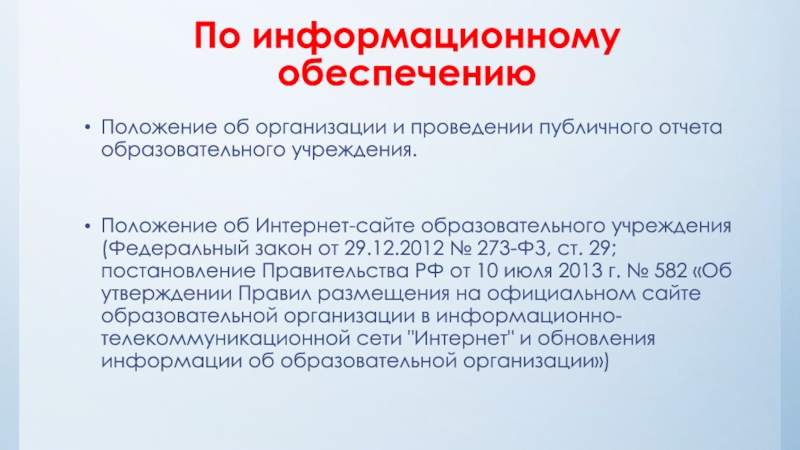 об Интернет-сайте образовательного учреждения (Федеральный закон от 29.12.2012 № 273-ФЗ, ст. 29; постановление Правительства РФ от 10 июля 2013 г. № 582 «Об утверждении Правил размещения на официальном сайте образовательной организации в информационно-телекоммуникационной сети "Интернет" и обновления информации об образовательной организации»)