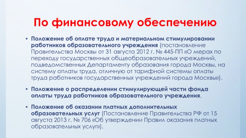 учреждения (постановление Правительства Москвы от 31 августа 2012 г. № 445-ПП «О мерах по переходу государственных общеобразовательных учреждений, подведомственных Департаменту образования города Москвы, на систему оплаты труда, отличную от тарифной системы оплаты труда работников государственных учреждений города Москвы»).