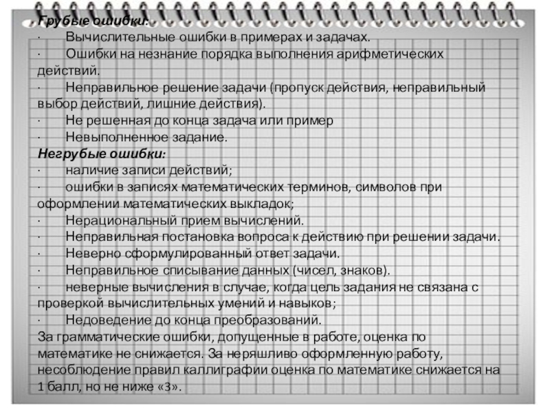 · Повторная ошибка в одном и том же слове считается за 1ошибку (например, ученик дважды в слове «песок» написал вместо «е» букву «и»).