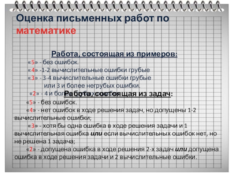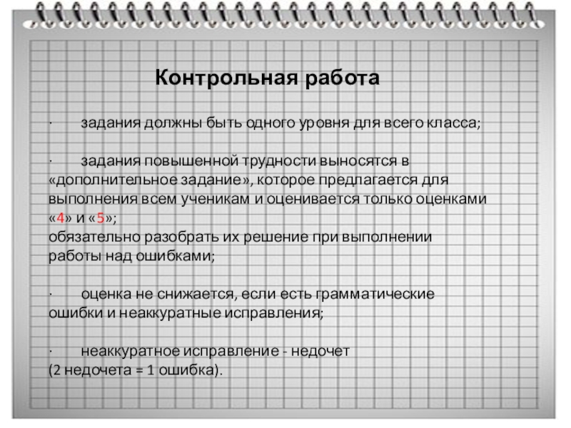 При оценке контрольной работы учитывается в первую очередь правильность ее выполнения. Исправления, которые сделал учащийся, не влияют на оценку (за исключением такого вида работ, как контрольное списывание). Учитывается только последнее написание. Оформление работы так же не должно влиять на оценку, ибо в таком случае проверяющий работу может быть недостаточно объективным. При оценивании работы учитель принимает во внимание каллиграфический навык. При оценивании работы принимается во внимание не только количество, но и характер ошибок.