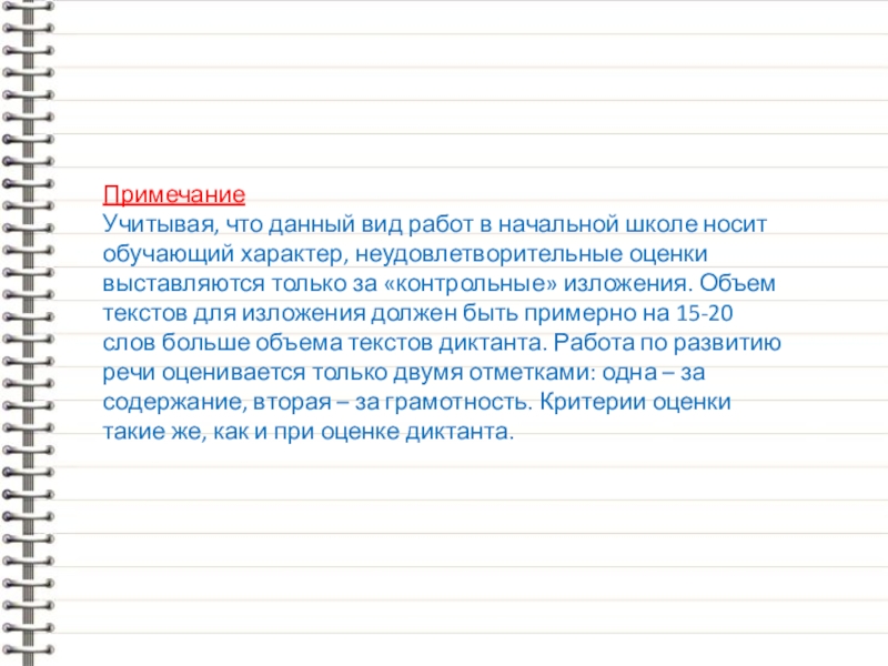 Оценка «2» за сочинение, изложение в начальной школе не ставится. При этом все ошибки исправляются, учитель дает содержательную оценку работе на словах. После индивидуальной работы с учащимся над данным видом деятельности выставляется отметка на один балл выше.