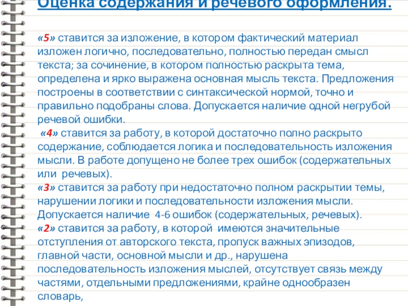 изложений и сочинений является достаточно полное, последовательное, логичное воспроизведение содержания авторского текста или составление собственного, грамотное речевое оформление, правильное употребление слов, нормативное построение предложений, лексическое разнообразие, орфографическая грамотность.
