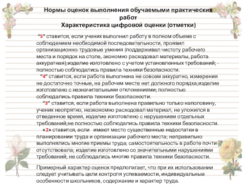 Примерный характер оценок предполагает, что при их использовании следует учитывать цели контроля успеваемости, индивидуальные особенности школьников, содержание и характер труда.