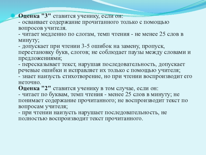 - читает по буквам, темп чтения - менее 25 слов в минуту; не понимает содержание прочитанного; не воспроизводит текст по вопросам учителя;