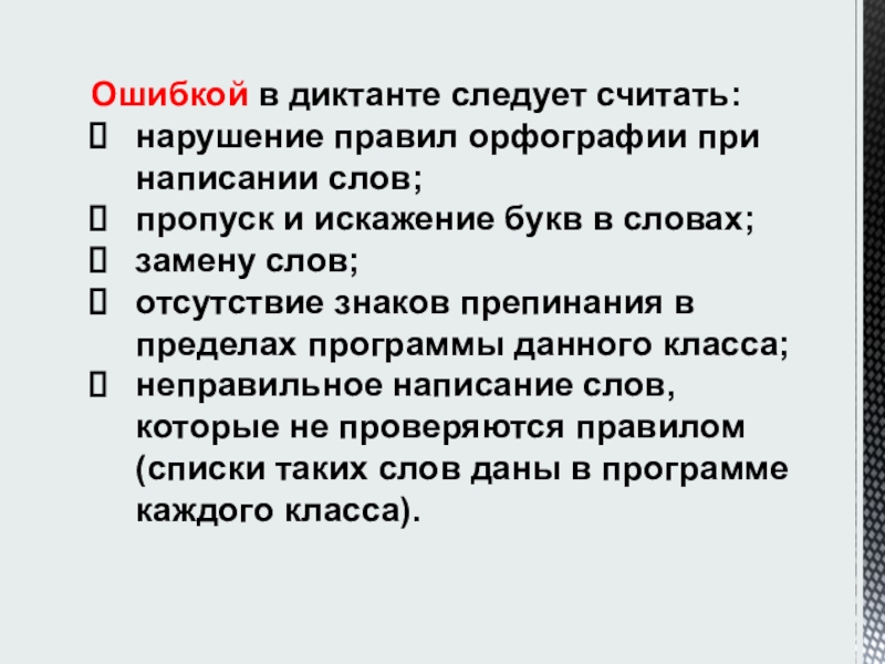 неправильное написание слов, которые не проверяются правилом (списки таких слов даны в программе каждого класса).