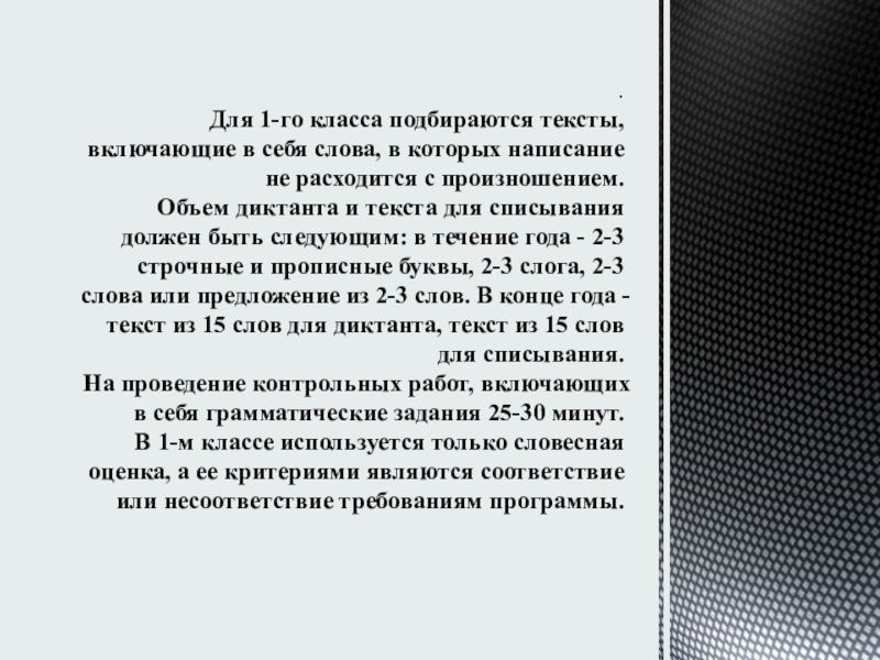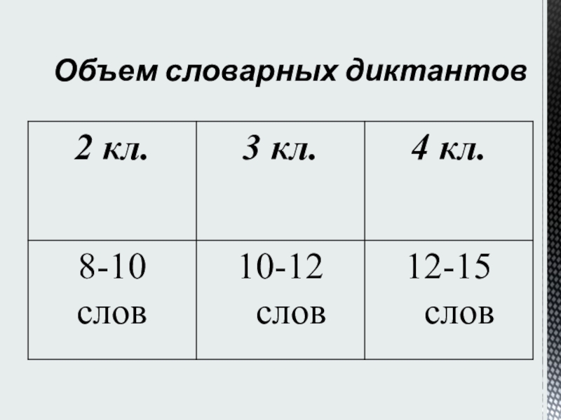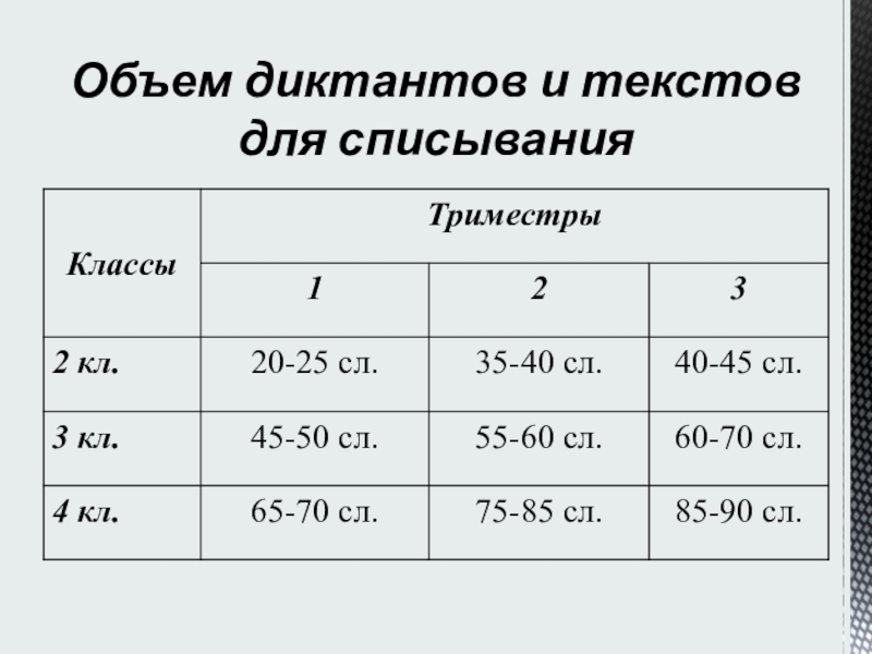 Объем диктанта и текста для списывания должен быть следующим: в течение года - 2-3 строчные и прописные буквы, 2-3 слога, 2-3 слова или предложение из 2-3 слов. В конце года - текст из 15 слов для диктанта, текст из 15 слов для списывания.