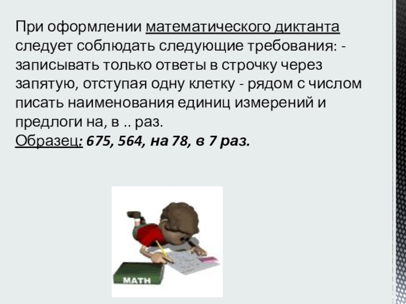 Слайд 30При оформлении математического диктанта следует соблюдать следующие требования: - записывать только