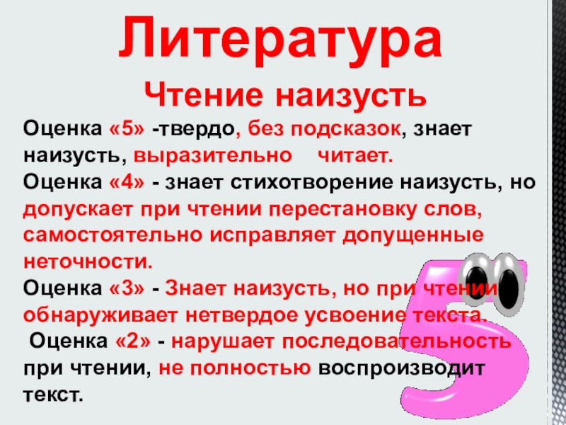 Оценка «5» -твердо, без подсказок, знает наизусть, выразительно читает.