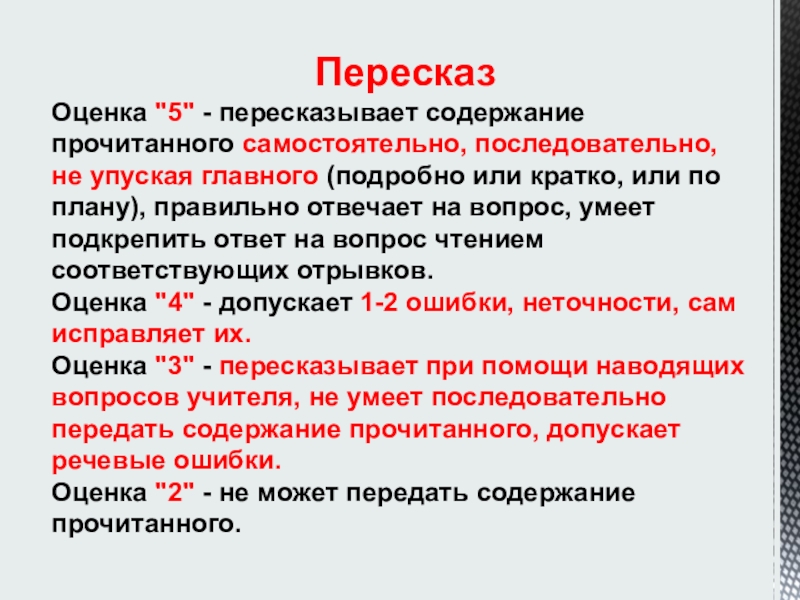 Оценка "5" - пересказывает содержание прочитанного самостоятельно, последовательно, не упуская главного