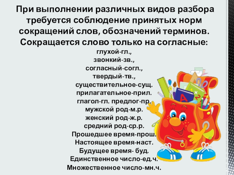 Слайд 26 При выполнении различных видов разбора требуется соблюдение принятых норм сокращений слов,