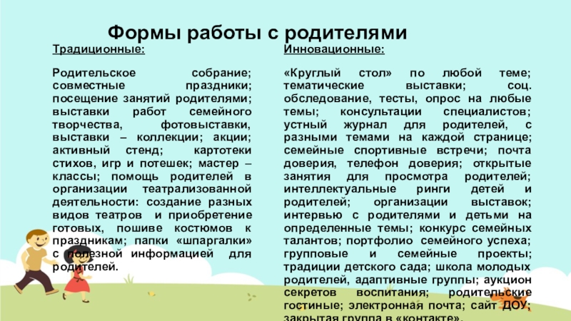 «Круглый стол» по любой теме; тематические выставки; соц. обследование, тесты, опрос на любые темы; консультации специалистов; устный журнал для родителей, с разными темами на каждой странице; семейные спортивные встречи; почта доверия, телефон доверия; открытые занятия для просмотра родителей; интеллектуальные ринги детей и родителей; организации выставок; интервью с родителями и детьми на определенные темы; конкурс семейных талантов; портфолио семейного успеха; групповые и семейные проекты; традиции детского сада; школа молодых родителей, адаптивные группы; аукцион секретов воспитания; родительские гостиные; электронная почта; сайт ДОУ; закрытая группа в «контакте».