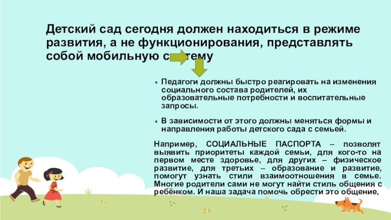 Педагоги должны быстро реагировать на изменения социального состава родителей, их образовательные потребности и воспитательные запросы.