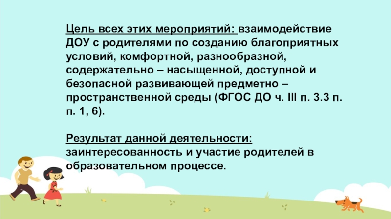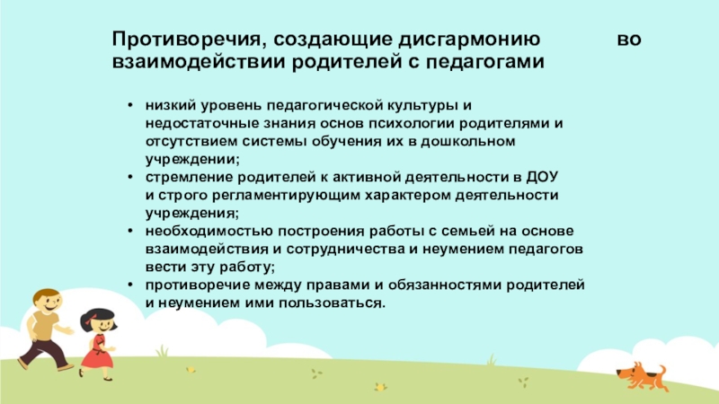 стремление родителей к активной деятельности в ДОУ и строго регламентирующим характером деятельности учреждения;