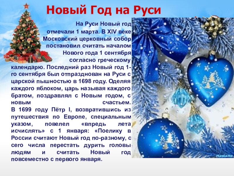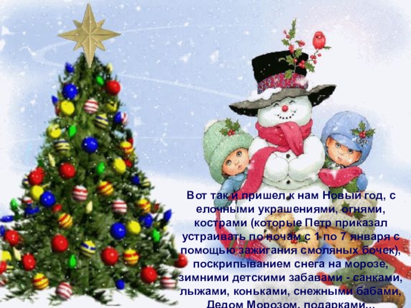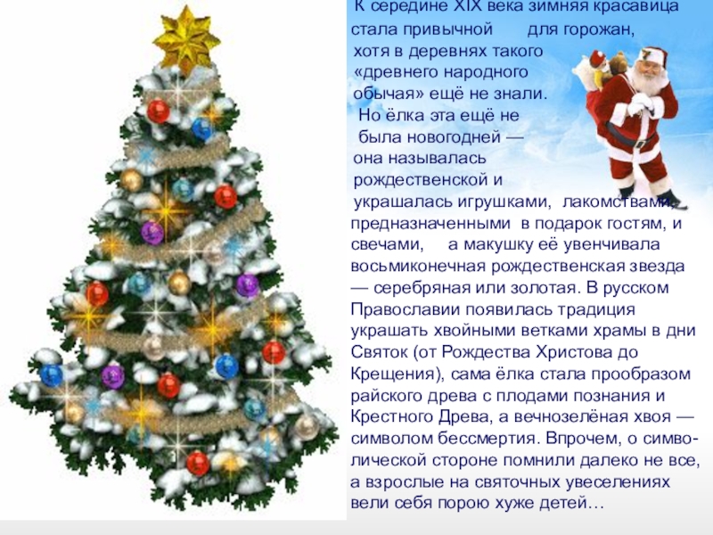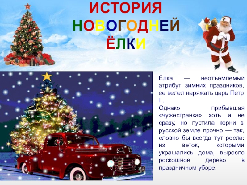 Ёлка — неотъемлемый атрибут зимних праздников,ее велел наряжать царь Петр I .