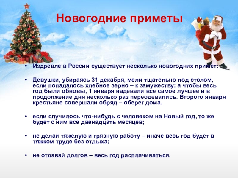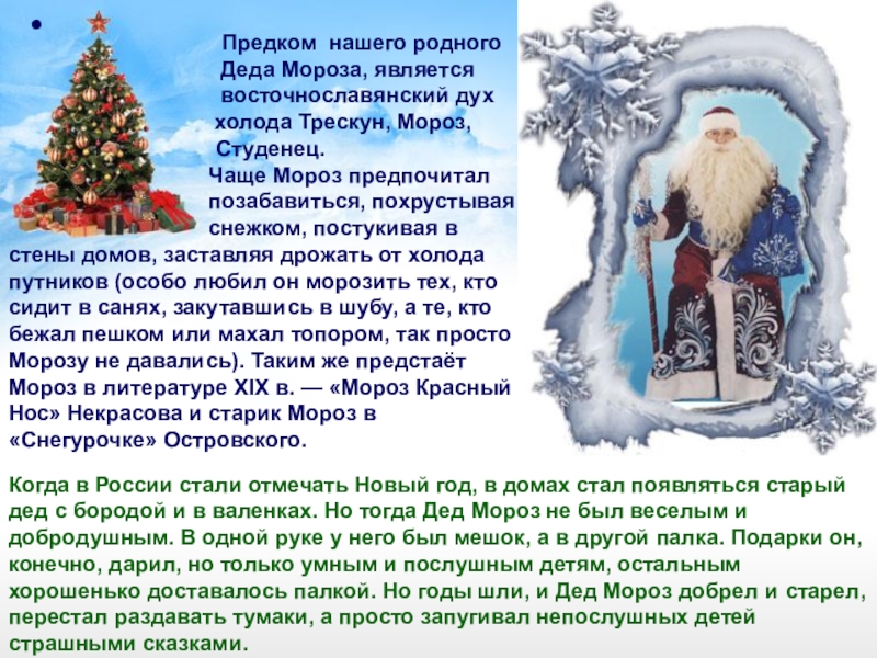 Когда в России стали отмечать Новый год, в домах стал появляться старый дед с бородой и в валенках. Но тогда Дед Мороз не был веселым и добродушным. В одной руке у него был мешок, а в другой палка. Подарки он, конечно, дарил, но только умным и послушным детям, остальным хорошенько доставалось палкой. Но годы шли, и Дед Мороз добрел и старел, перестал раздавать тумаки, а просто запугивал непослушных детей страшными сказками.