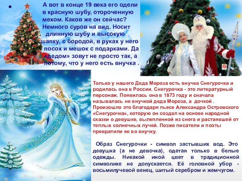 Только у нашего Деда Мороза есть внучка Снегурочка и родилась она в России. Снегурочка - это литературный персонаж. Появилась она в 1873 году и сначала называлась не внучкой деда Мороза, а дочкой . Произошло это благодаря пьесе Александра Островского «Снегурочка», которую он создал на основе народной сказки о девушке, вылепленной из снега и растаявшей от теплых солнечных лучей. Позже писатели и поэты превратили ее во внучку.