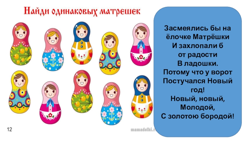 Засмеялись бы на ёлочке Матрёшки И захлопали б от радостиВ ладошки.Потому что у воротПостучался Новый год!Новый, новый,Молодой,С