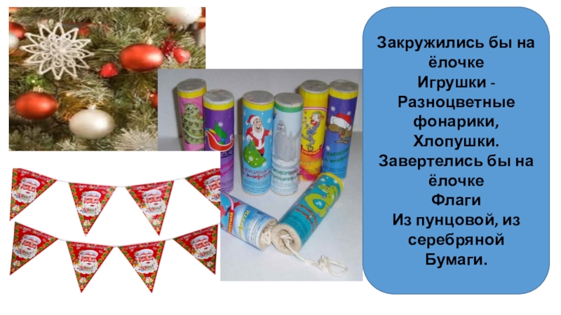 Закружились бы на ёлочкеИгрушки -Разноцветные фонарики,Хлопушки.Завертелись бы на ёлочкеФлагиИз пунцовой, из серебрянойБумаги.