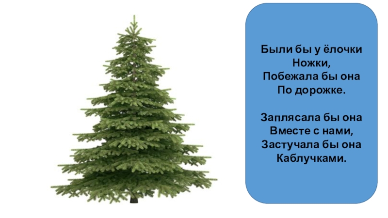 Были бы у ёлочкиНожки,Побежала бы онаПо дорожке.Заплясала бы онаВместе с нами,Застучала бы онаКаблучками.