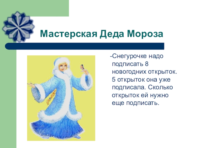 Мастерская Деда Мороза  -Снегурочке надо подписать 8 новогодних открыток. 5 открыток она уже подписала. Сколько открыток