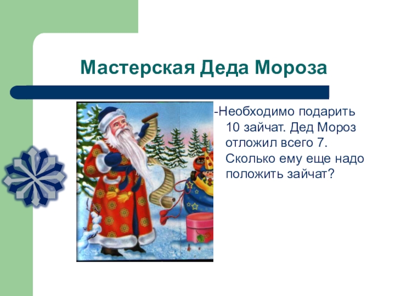 Мастерская Деда Мороза -Необходимо подарить 10 зайчат. Дед Мороз отложил всего 7. Сколько ему еще надо положить