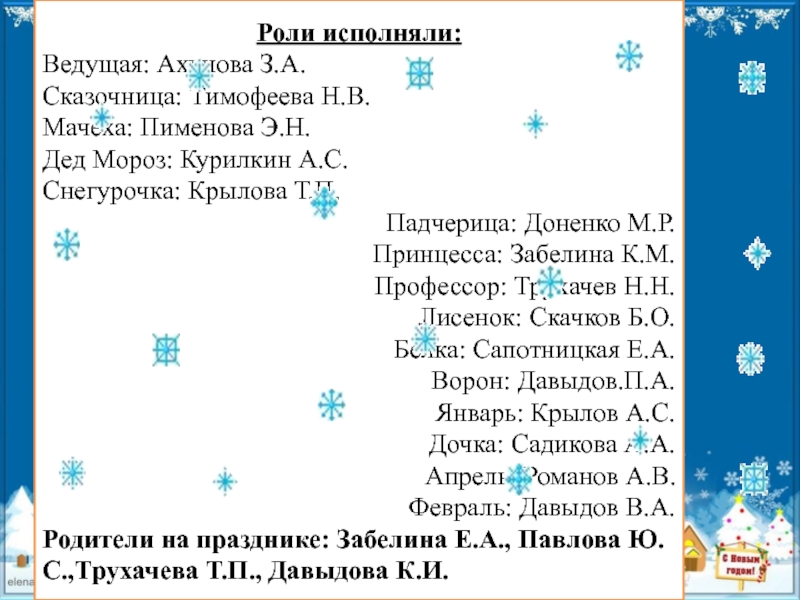 Роли исполняли:Ведущая: Ахунова З.А.Сказочница: Тимофеева Н.В.Мачеха: Пименова Э.Н.Дед Мороз: Курилкин А.С.Снегурочка: Крылова Т.П.Падчерица: Доненко М.Р.Принцесса: Забелина К.М.Профессор: Трухачев Н.Н.Лисенок: Скачков Б.О.Белка: Сапотницкая Е.А.Ворон: Давыдов.П.А.Январь: Крылов А.С.Дочка: Садикова А.А.Апрель: Романов А.В.Февраль: Давыдов В.А.Родители на празднике: Забелина Е.А.,