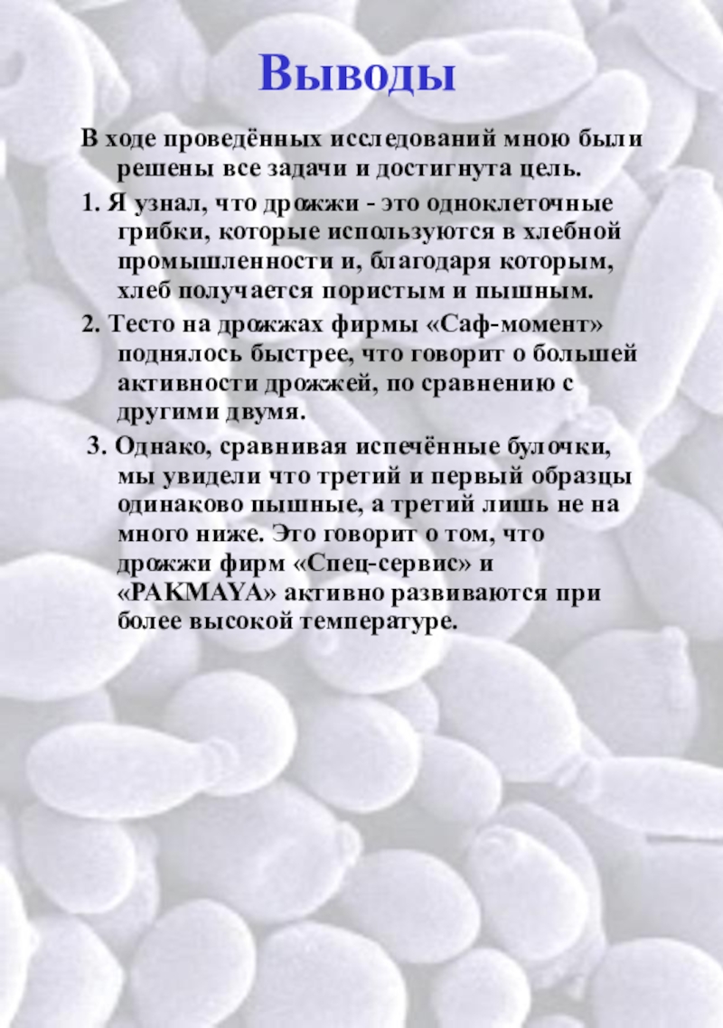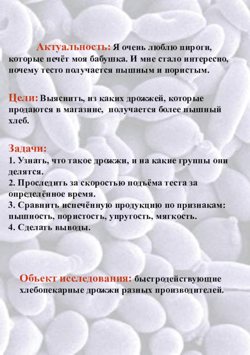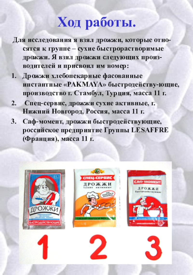 Объект исследования: быстродействующие хлебопекарные дрожжи разных производителей.