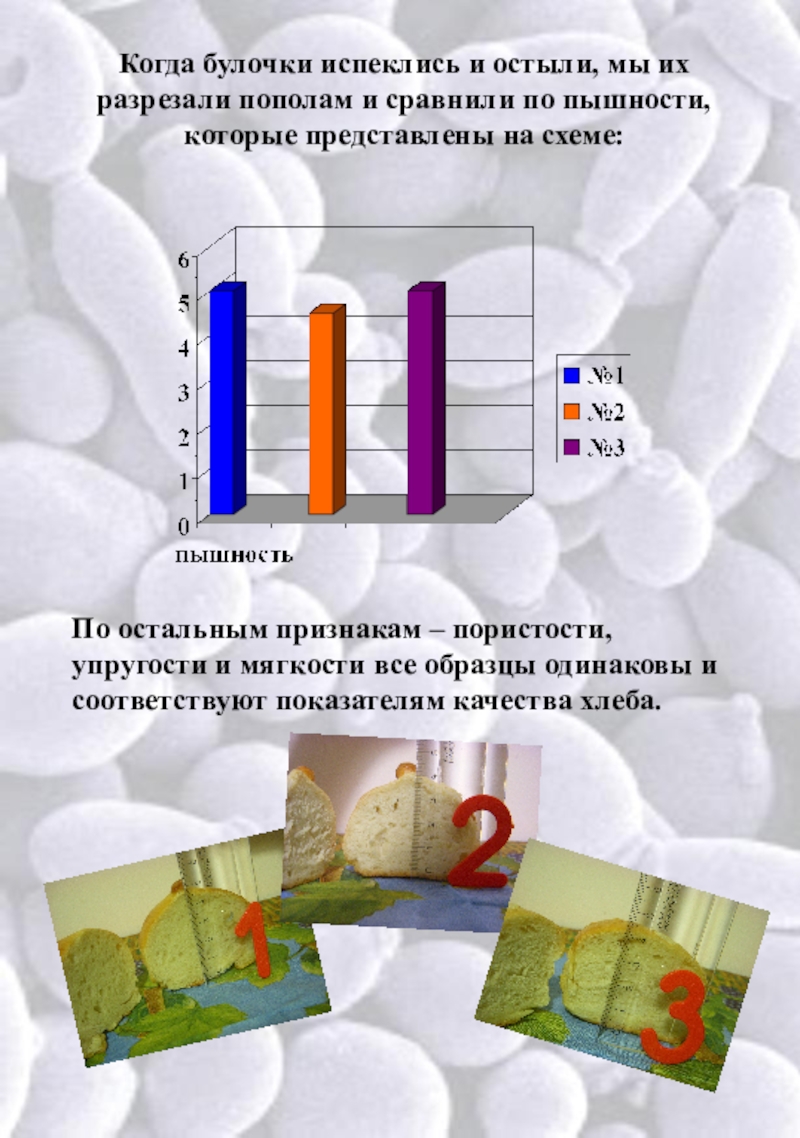 По остальным признакам – пористости, упругости и мягкости все образцы одинаковы и соответствуют показателям качества хлеба.