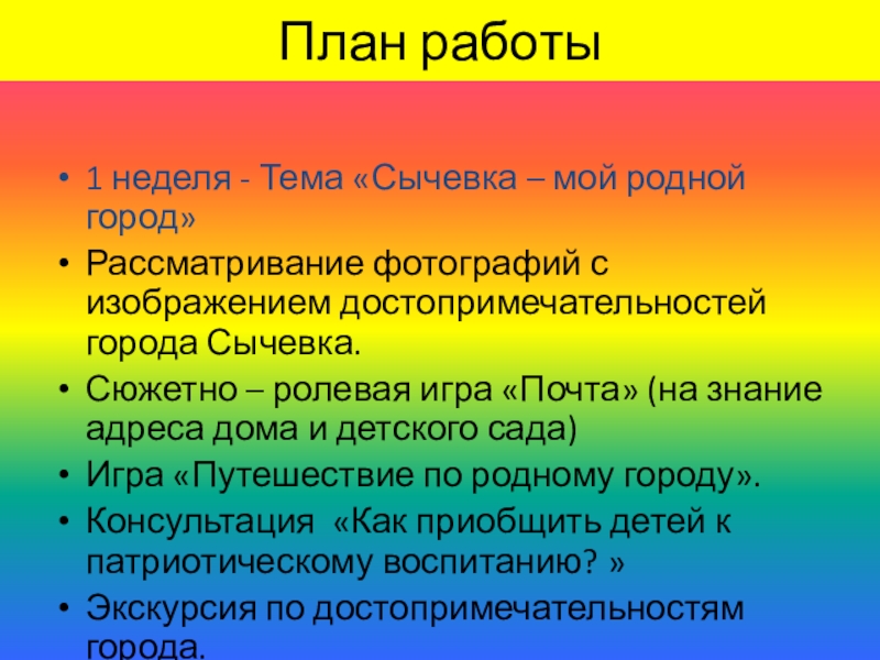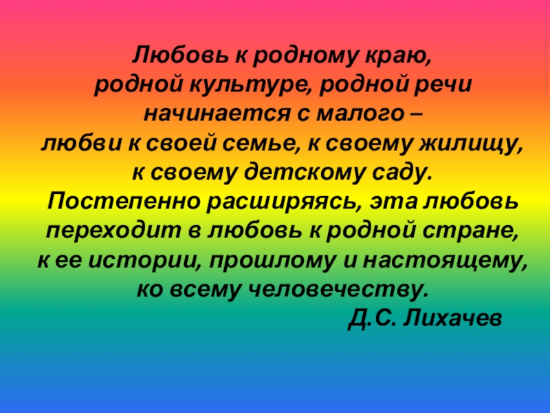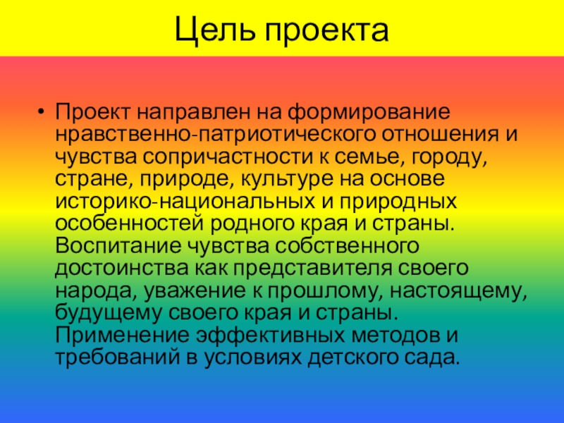 семье, городу, стране, природе, культуре на основе историко-национальных и природных особенностей родного края и страны. Воспитание чувства собственного достоинства как представителя своего народа, уважение к прошлому, настоящему, будущему своего края и страны. Применение эффективных методов и требований в условиях детского сада.