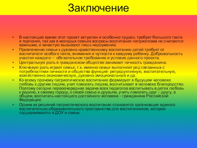 Ко всему прочему патриотическое воспитание формирует в будущем человеке любовь к другим людям, учит помогать людям, воспитывает в человеке благородство. Поэтому сегодня первоочередная задача всех педагогов воспитывать в детях любовь к родине, к своему городу, к своей семье и друзьям, учить помогать друг – другу, в общем, воспитать настоящего достойного человека – гражданина Российской Федерации.