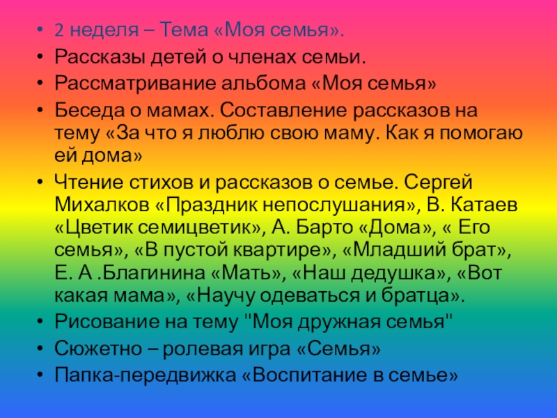 Чтение стихов и рассказов о семье. Сергей Михалков «Праздник непослушания», В. Катаев «Цветик семицветик», А. Барто «Дома», « Его семья», «В пустой квартире», «Младший брат», Е. А .Благинина «Мать», «Наш дедушка», «Вот какая мама», «Научу одеваться и братца».