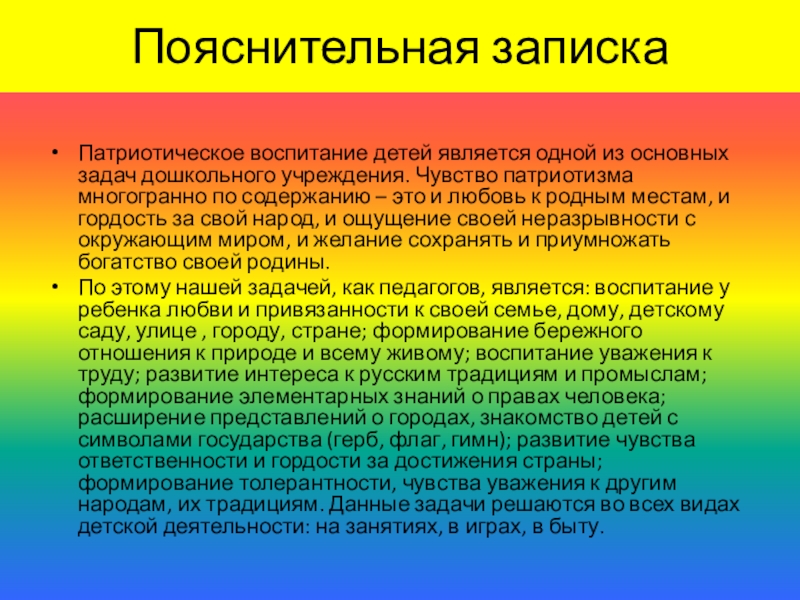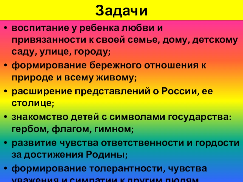 По этому нашей задачей, как педагогов, является: воспитание у ребенка любви и привязанности к своей семье, дому, детскому саду, улице , городу, стране; формирование бережного отношения к природе и всему живому; воспитание уважения к труду; развитие интереса к русским традициям и промыслам; формирование элементарных знаний о правах человека; расширение представлений о городах, знакомство детей с символами государства (герб, флаг, гимн); развитие чувства ответственности и гордости за достижения страны; формирование толерантности, чувства уважения к другим народам, их традициям. Данные задачи решаются во всех видах детской деятельности: на занятиях, в играх, в быту.