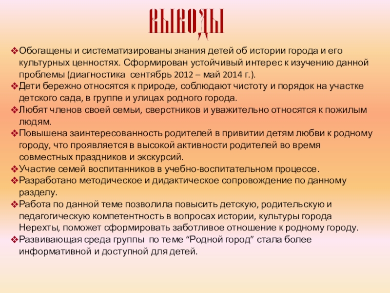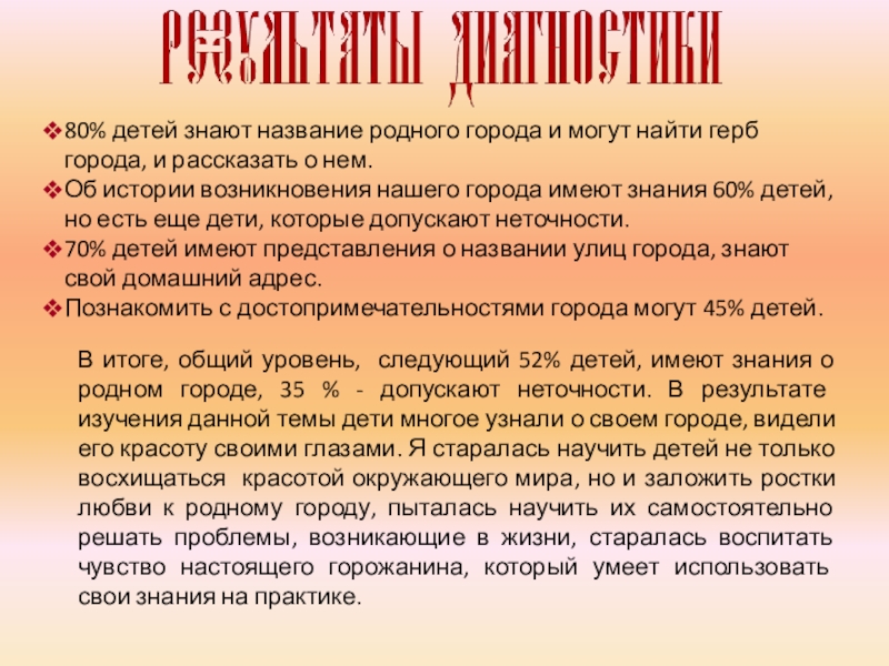 В итоге, общий уровень, следующий 52% детей, имеют знания о родном городе, 35 % - допускают неточности. В результате изучения данной темы дети многое узнали о своем городе, видели его красоту своими глазами. Я старалась научить детей не только восхищаться красотой окружающего мира, но и заложить ростки любви к родному городу, пыталась научить их самостоятельно решать проблемы, возникающие в жизни, старалась воспитать чувство настоящего горожанина, который умеет использовать свои знания на практике.