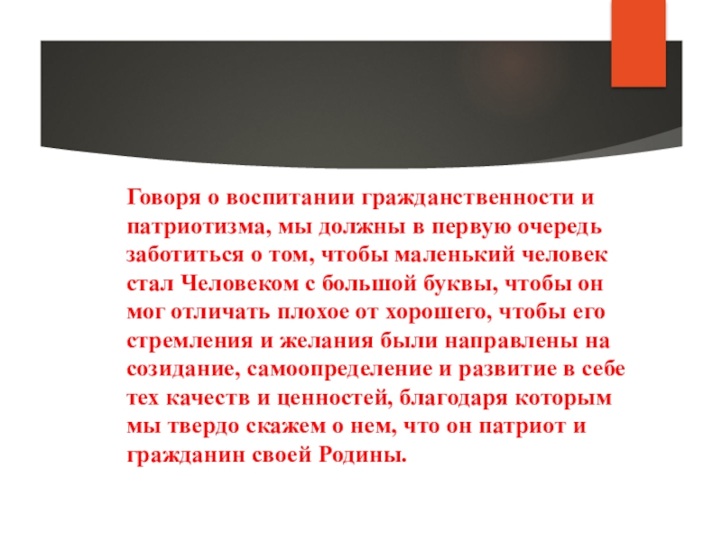 заботиться о том, чтобы маленький человек стал Человеком с большой буквы, чтобы он мог отличать плохое от хорошего, чтобы его стремления и желания были направлены на созидание, самоопределение и развитие в себе тех качеств и ценностей, благодаря которым мы твердо скажем о нем, что он патриот и гражданин своей Родины.