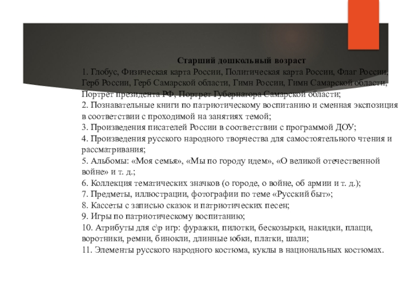 Примерный перечень оборудования при построении уголка по патриотическому воспитанию