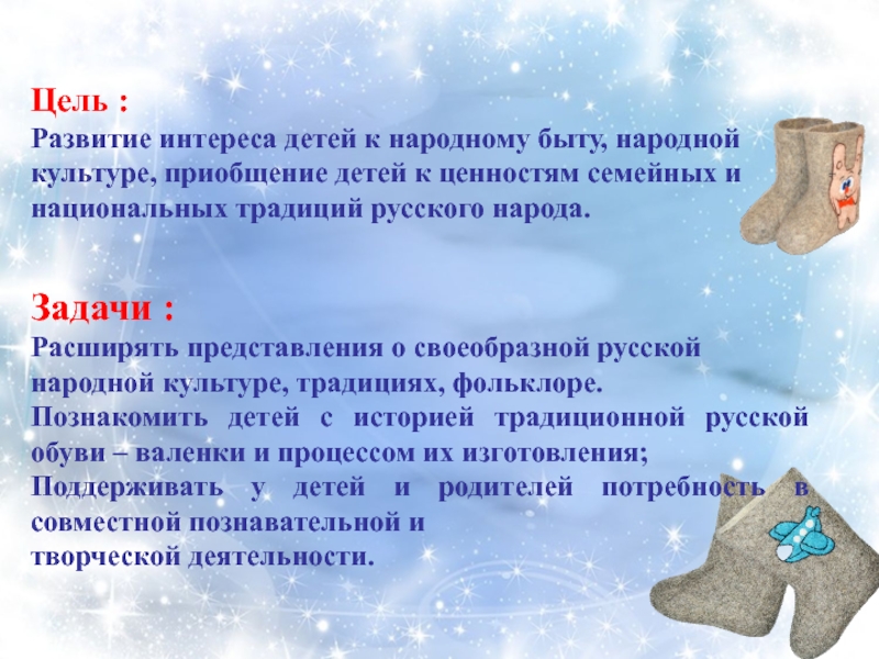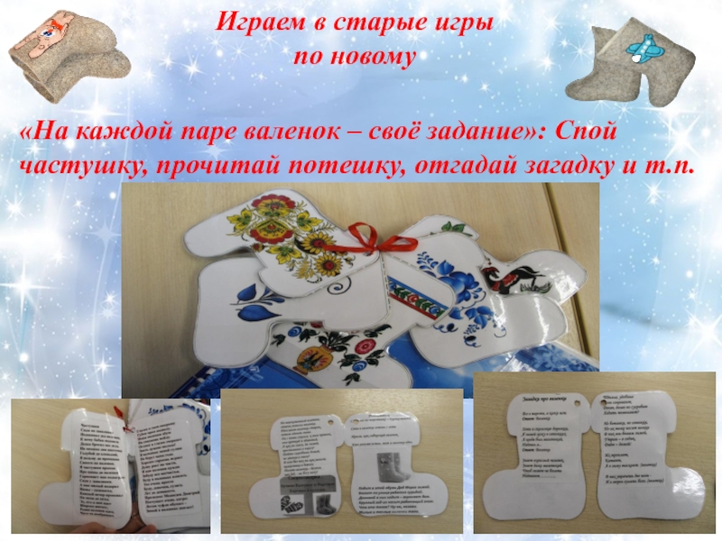 «На каждой паре валенок – своё задание»: Спой частушку, прочитай потешку, отгадай загадку и т.п.