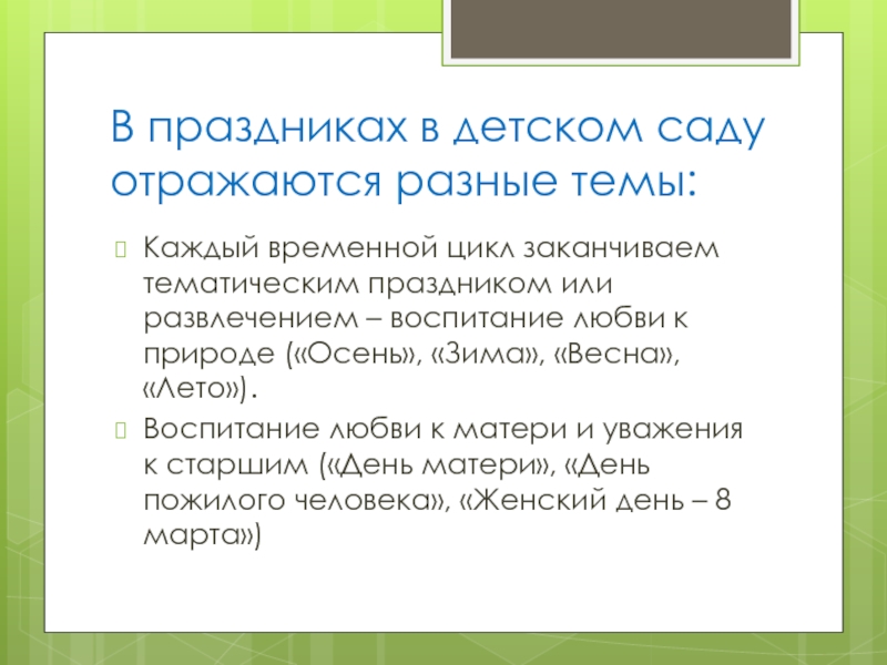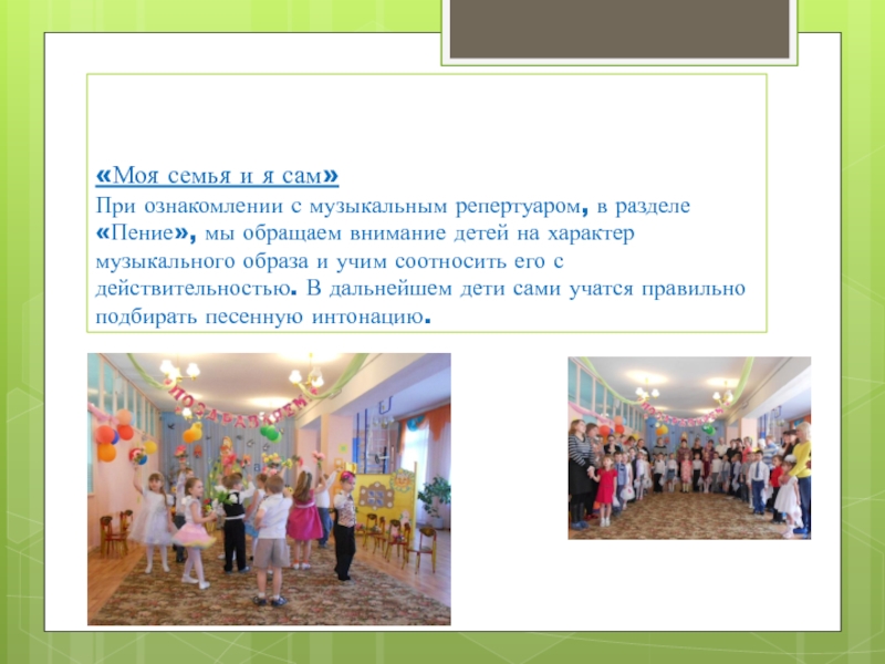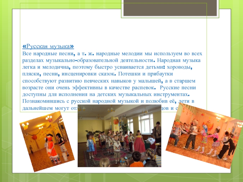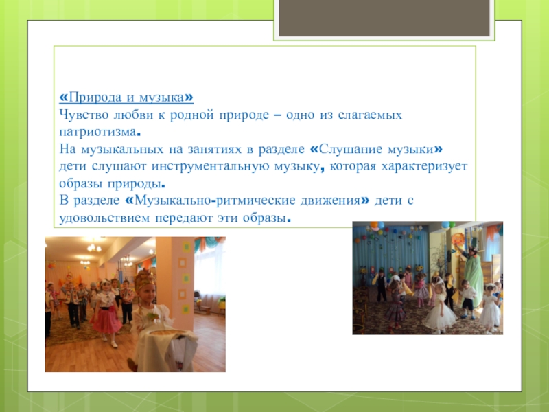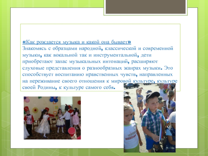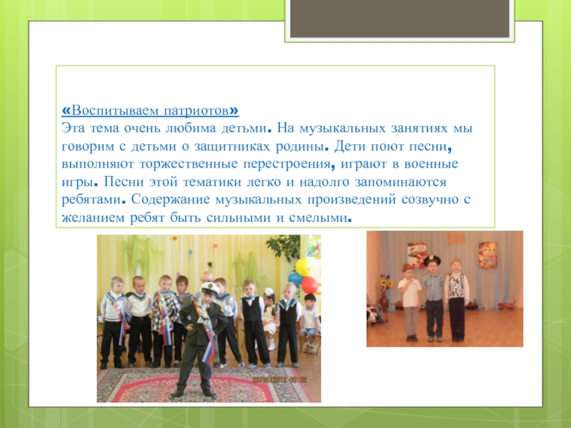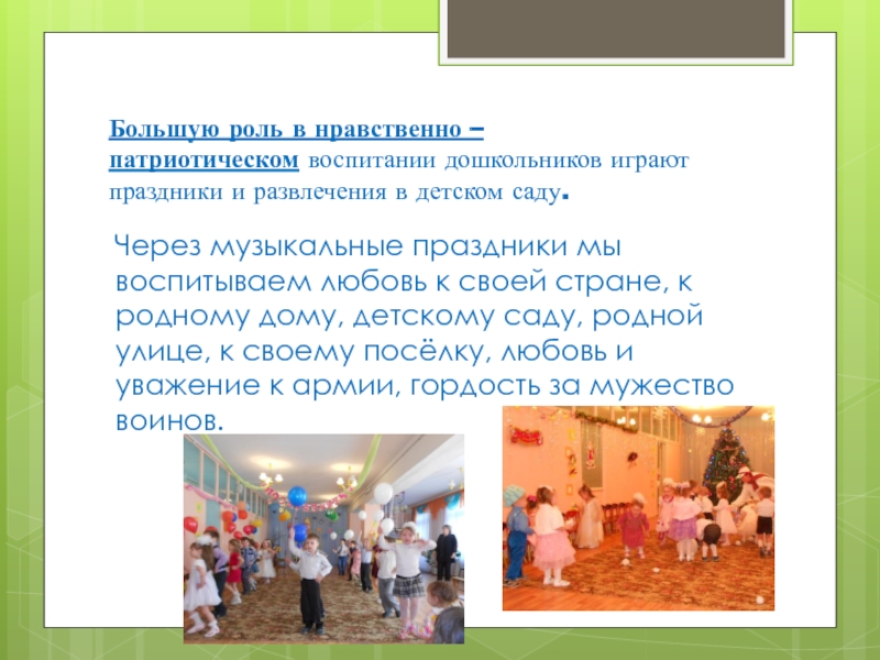 Через музыкальные праздники мы воспитываем любовь к своей стране, к родному дому, детскому саду, родной улице, к своему посёлку, любовь и уважение к армии, гордость за мужество воинов.