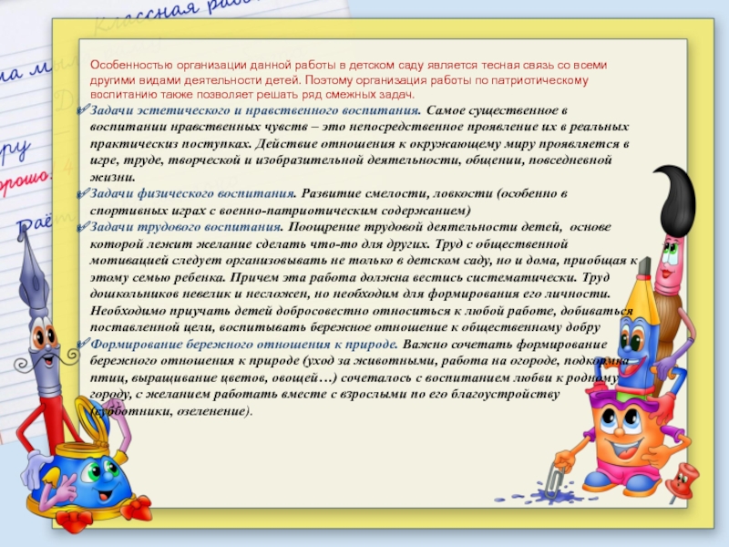 Эти задачи в детском саду решаются в играх, на занятиях и в быту, не только воспитывая в ребятах патриотические чувства, но и формируя их взаимоотношения с друзьями и взрослыми. Нравственно-патриотическое воспитание является сложным педагогическим процессом.